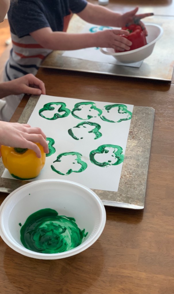 Supplies needed: large marshmallows or bell peppers (or both!), green finger paint (make sure it’s washable), white paper